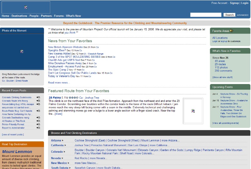 A recent post on the tech site Gizmodo highlighted the Internet Archive Wayback Machine, a website that has archived over 150,000,000,000 web pages since 1996. The cool thing about the IAWM archive is that you can see what most any website used to look like at a certain point in history. Gizmodo’s post dealt with how old tech websites used to look, but it gave me the idea of going back to see how our favorite climbing sites used to look.